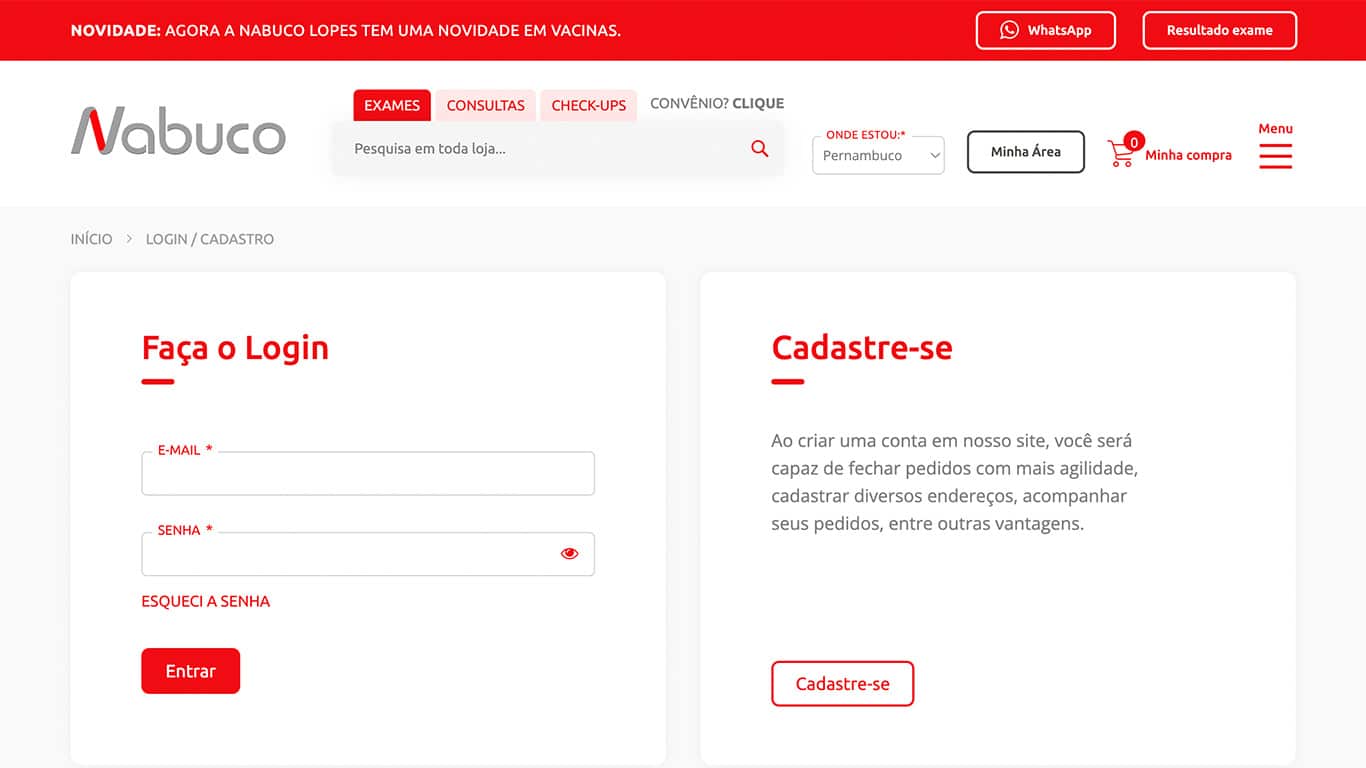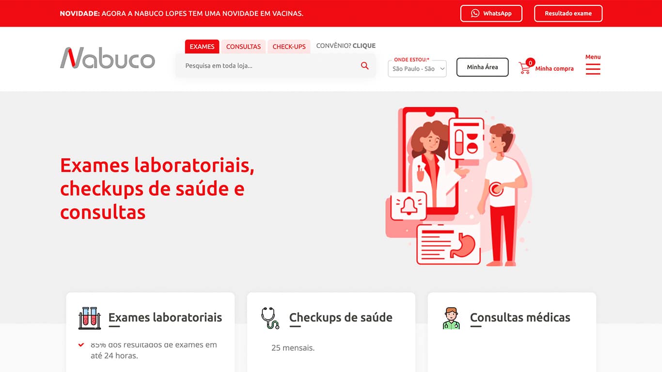 O Grupo Nabuco procurou a VitaminaWeb com o intuito de criar um e-commerce que pudesse otimizar a experiência dos clientes no agendamento de exames laboratoriais, checkups de saúde e consultas médicas.
